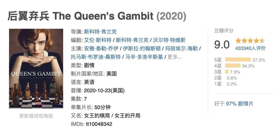 陈述了孤儿贝丝·哈蒙在六十年代成长为国外象棋天才的励志故事。