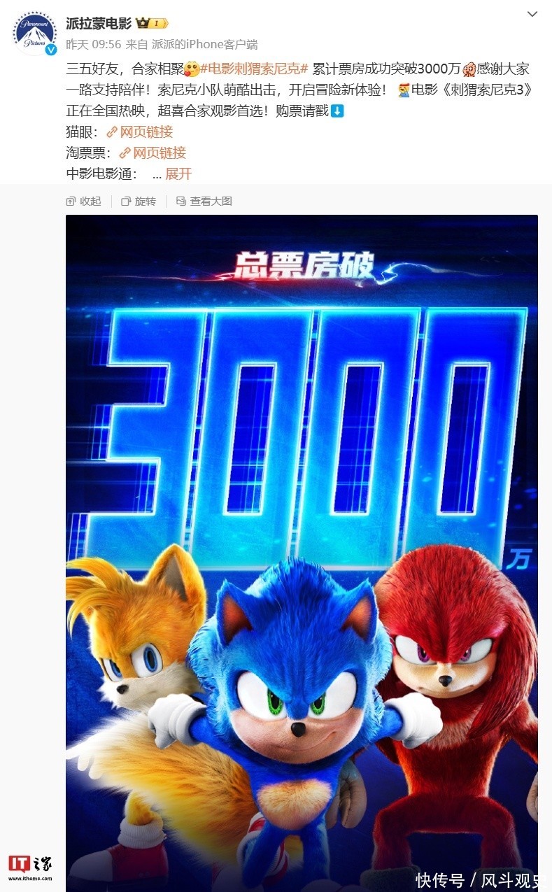 据此前报说念,电影《刺猬索尼克 3》已于 2025 年 1 月 10 日在内地上映,派拉蒙影片公司官方微博昨日发文文书,影片累计票房得胜冲破 3000 万。