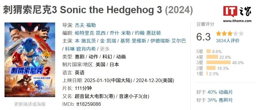 划定IT之家发稿,现在《刺猬索尼克 3》豆瓣评分 6.3 分,其中 8.6% 的用户给出 5 星评价、22.8% 的用户给出 4 星、48.0% 给出 3 星、18.3% 给出 2 星、2.3% 给出 1 星。