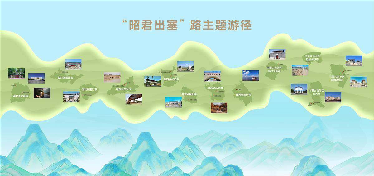 “昭君出塞路主题游径” 具体清亮为:昭君村——宜昌博物馆——荆州博物馆——荆门市博物馆——汉长安城未央宫名胜——宣平里——甘泉宫名胜——石门山国度丛林公园——庆阳市博物馆——车路梁——延安博物馆——红碱淖——昭君城——昭君岛——包头博物馆——昭君博物院——内蒙古博物院。