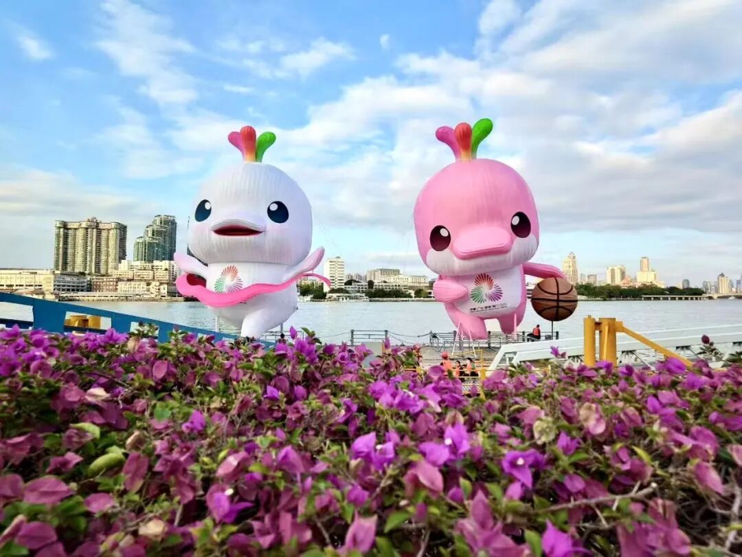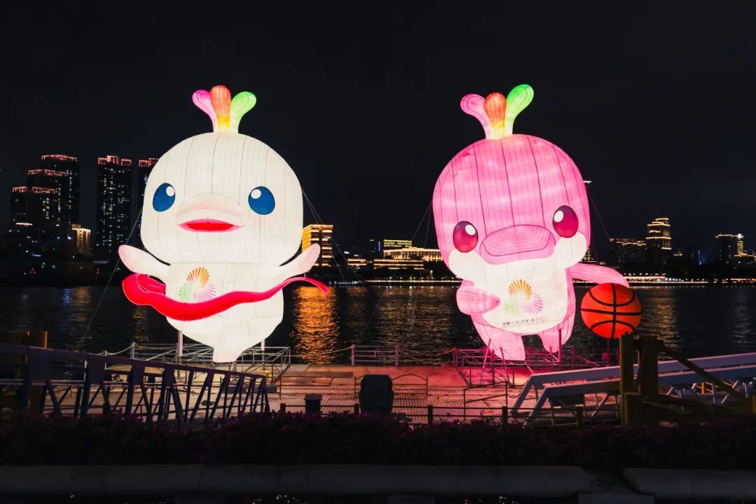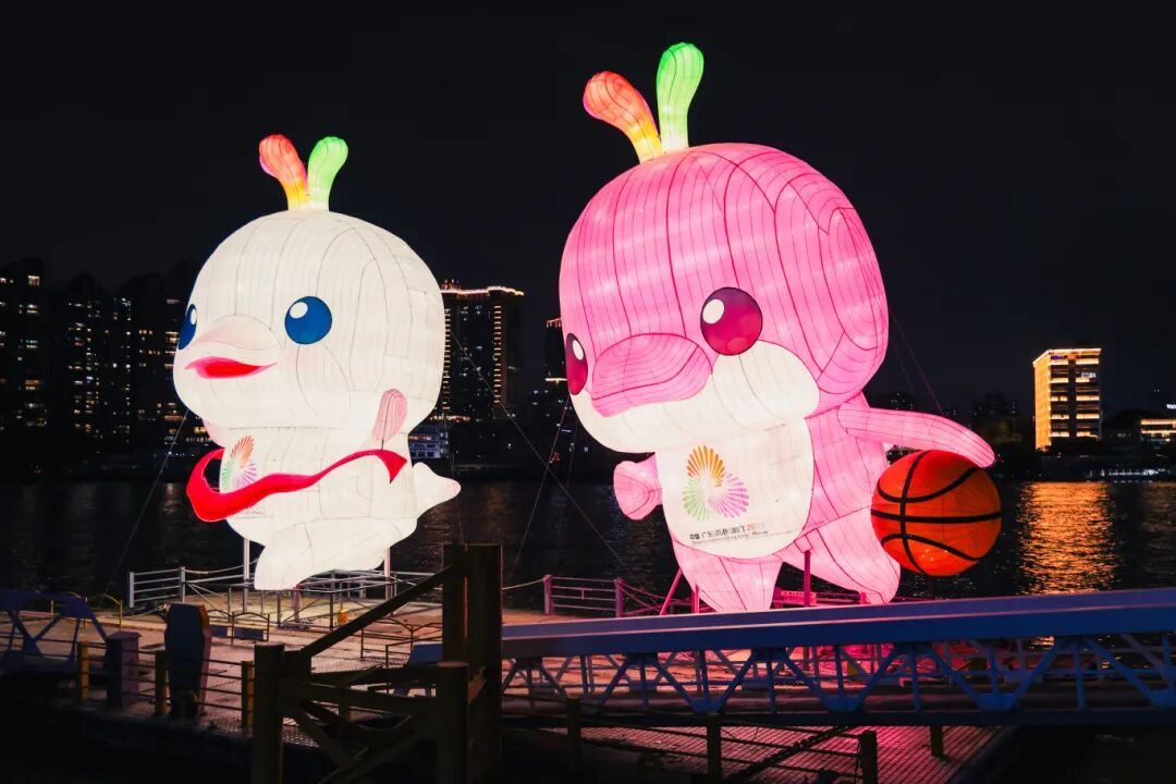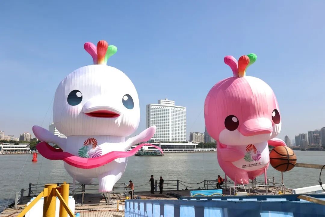 11月5日晚,十五运会祯祥物大型安装在白鹅潭畔负责亮灯。此次,两只小海豚永别以田径和篮球造型和市民一又友“碰面”,萌趣可儿!
