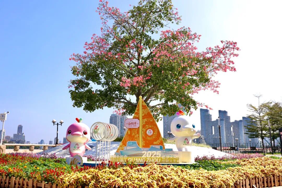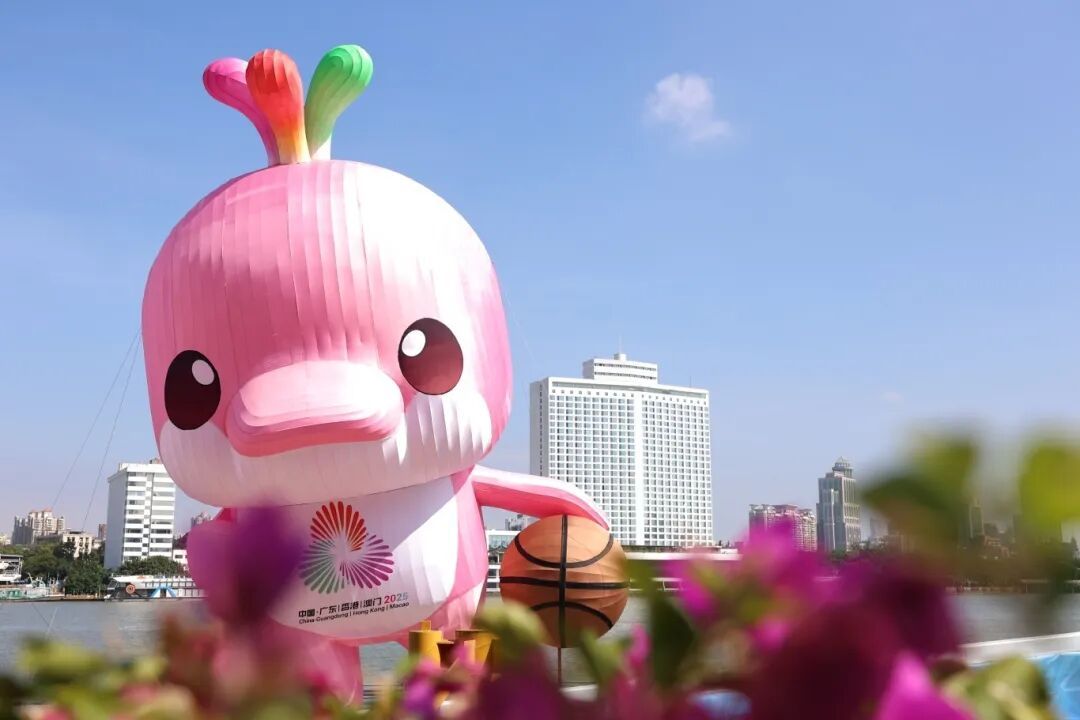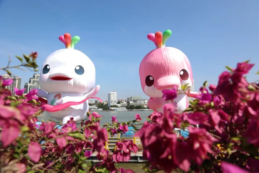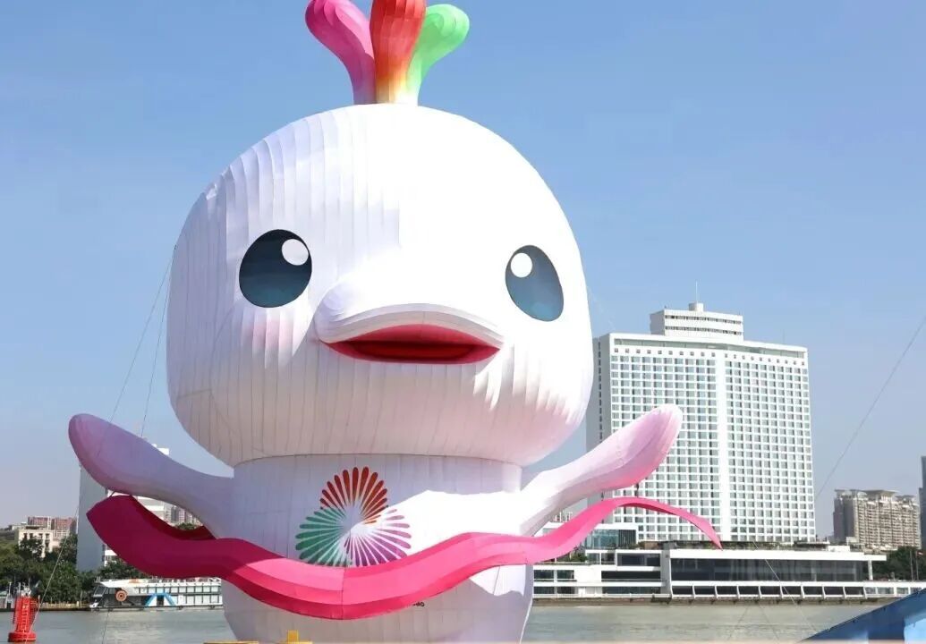 11月5日晚,十五运会祯祥物大型安装在白鹅潭畔负责亮灯。此次,两只小海豚永别以田径和篮球造型和市民一又友“碰面”,萌趣可儿!