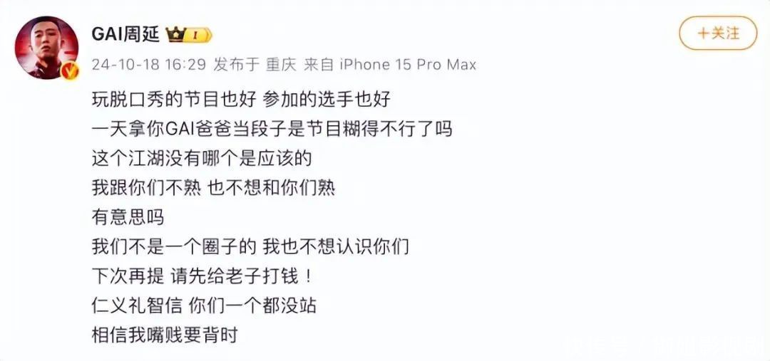 对此,GAI发文怒怼:“玩脱口秀的节目也好,参加的选手也好。一天拿我当段子是节目糊得不能了吗?这个江湖莫得哪个是应该的,我跟你们不熟,也不念念和你们熟,挑升义吗?咱们不是一个圈子的,我也不念念意志你们,下次再提,请先给我打钱!仁义礼智信,你们一个齐没站。”