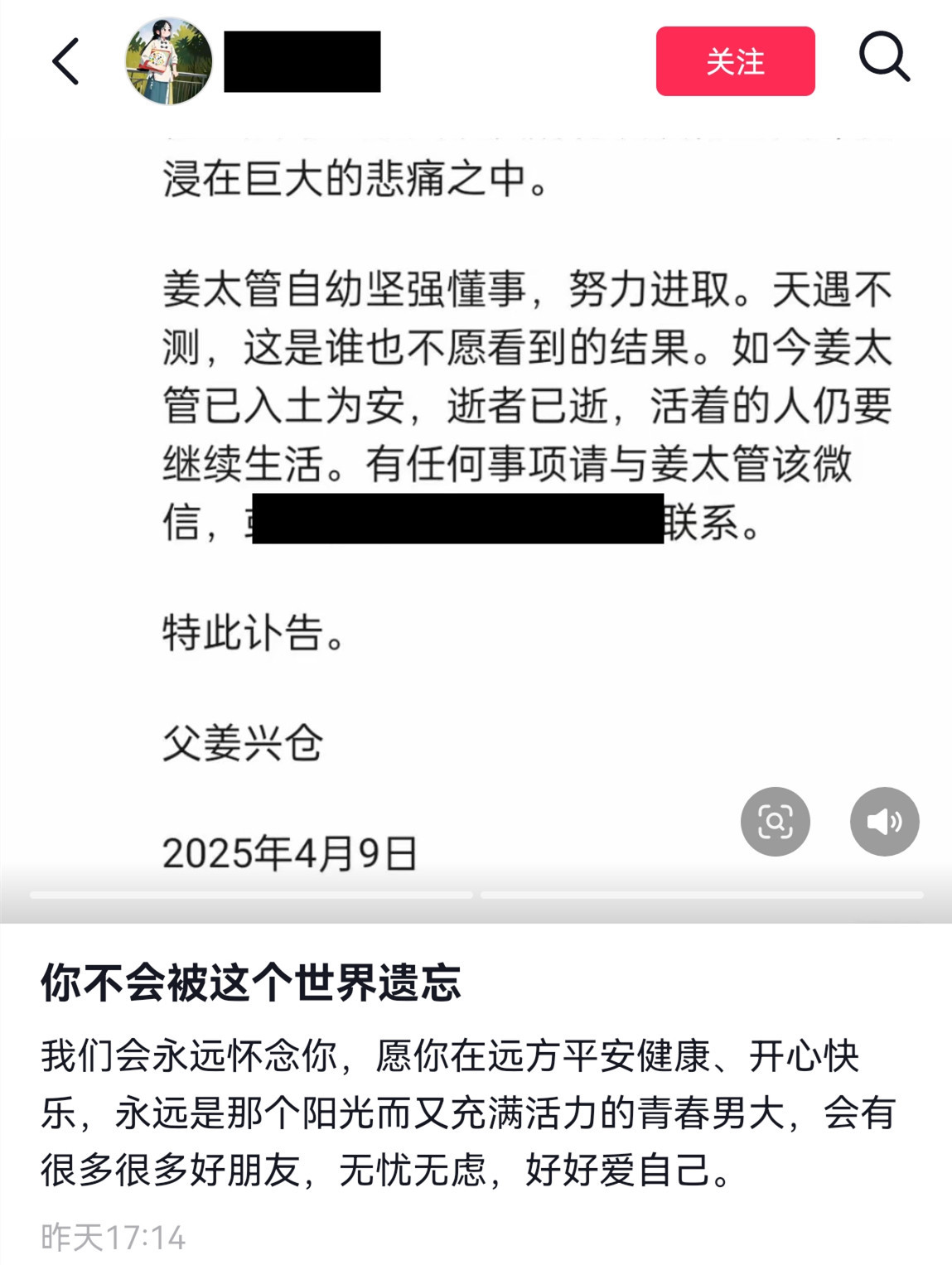 两位一又友王人晒出了姜太管的讣告,左证讣告可知,姜太管于2025年4月6日亏空,死因是在投入马拉松比赛时横祸暴毙。