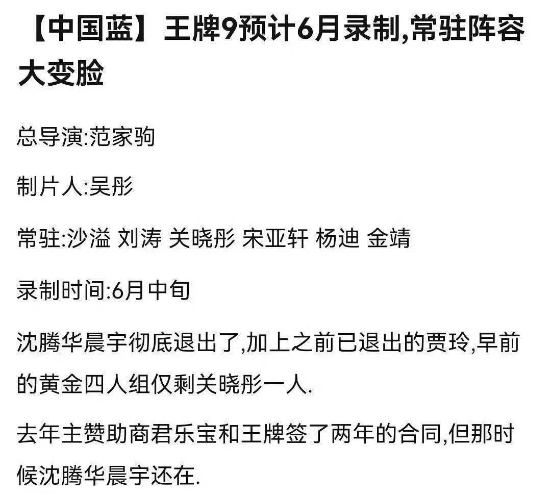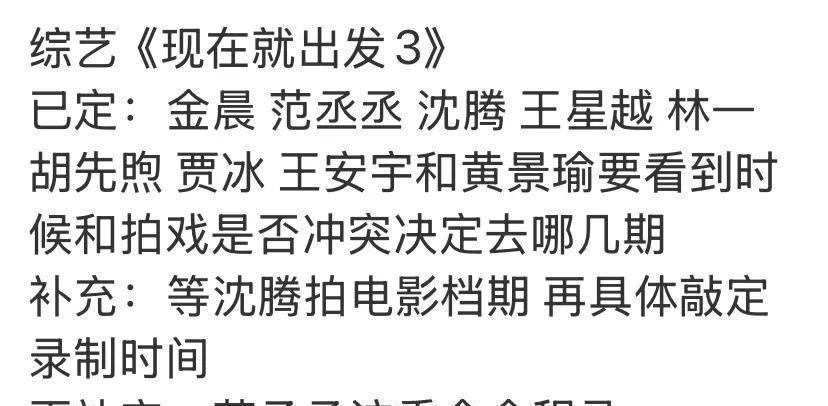 另外还有沈腾和华晨宇,本年华晨宇全年齐有巡演安排,其粉丝默示他已详情不会参与《王牌9》的录制。沈腾则已详情会不息干涉腾讯视频综艺《现时就动身》第三季的录制,况且他刚进组大制作电影《流浪地球3》。这部电影拍完后,他还会加盟韩寒电影《奔驰东说念主生》第三部的拍摄,行程极为紧凑,是以传说他也将缺席《王牌9》的录制。