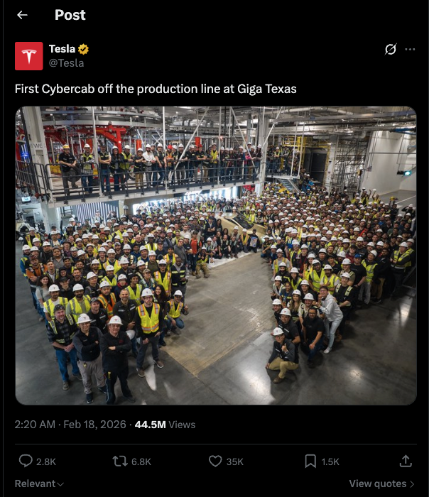 2月18日,特斯拉在X上告示:第一台Cybercab量产车,已在德州超等工场追究下线。 由于期间点恰逢中国农历大年头二,且特斯拉并未对这一音书进行大限制宣发,这个节点在国内并莫得激起太多水花。