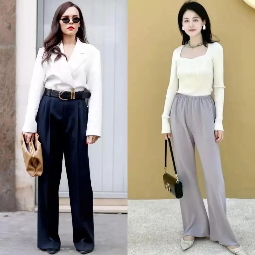 固然右边的这一套也很顺眼,然则不太保举平常各人女性穿搭,关于下半身的腿型条款极高,非常是这一条微喇叭的失业玄色长裤,大腿相比粗的话,根柢穿不出这么的后果蔼然质。