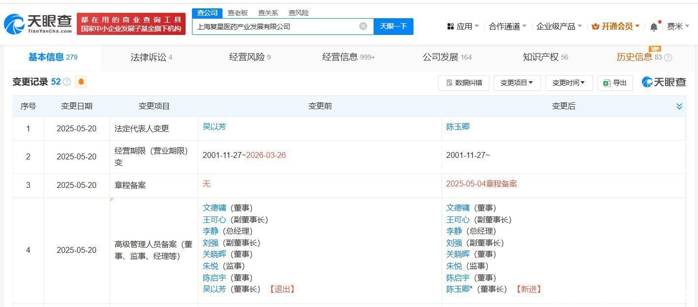 天眼查App走漏云开体育,近日,上海复星医药产业发展有限公司发生工商变更,吴以芳卸任法定代表东谈主、董事长,由陈玉卿接任。不久前,陈玉卿刚接任复星医药(600196)法定代表东谈主、董事长。